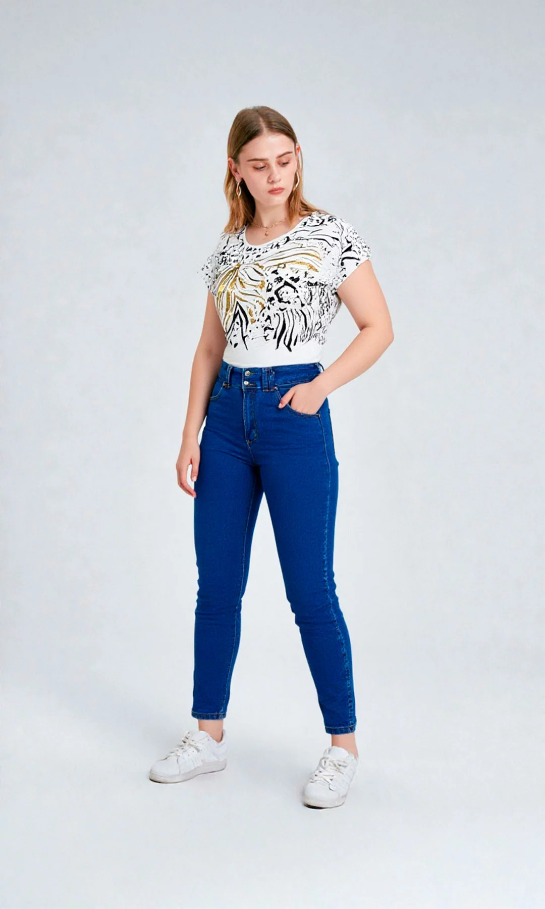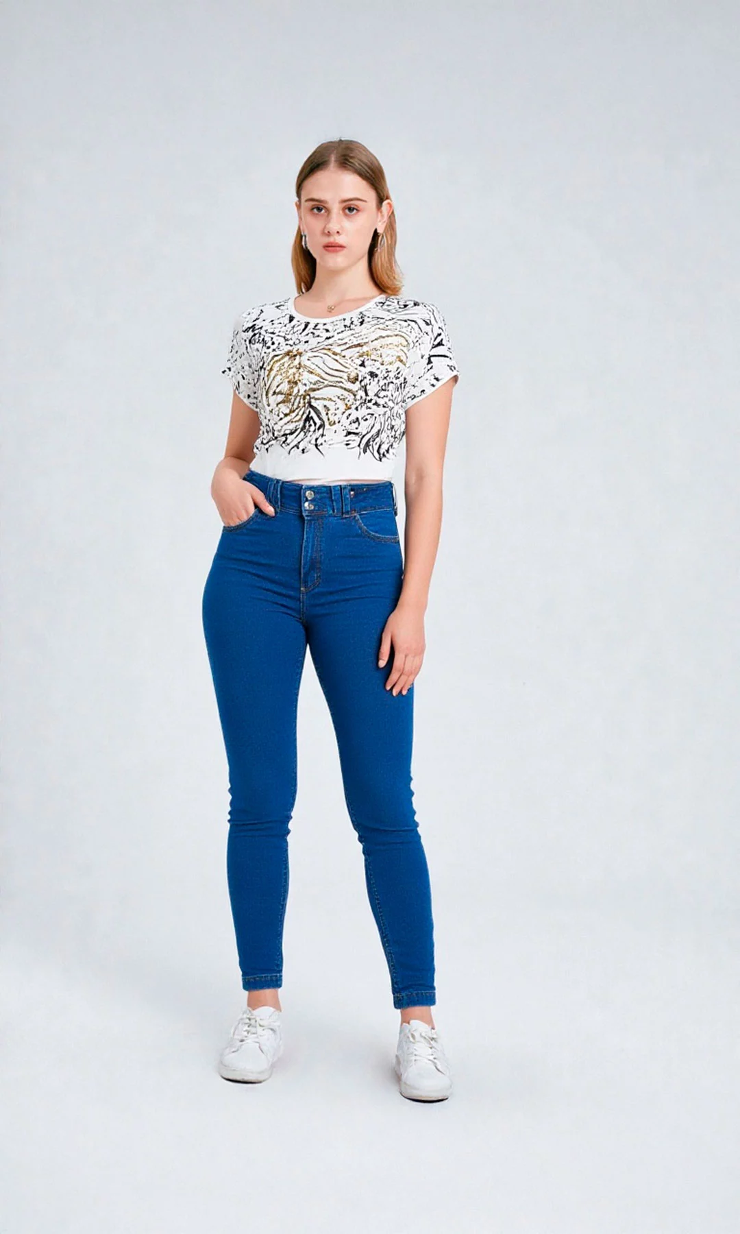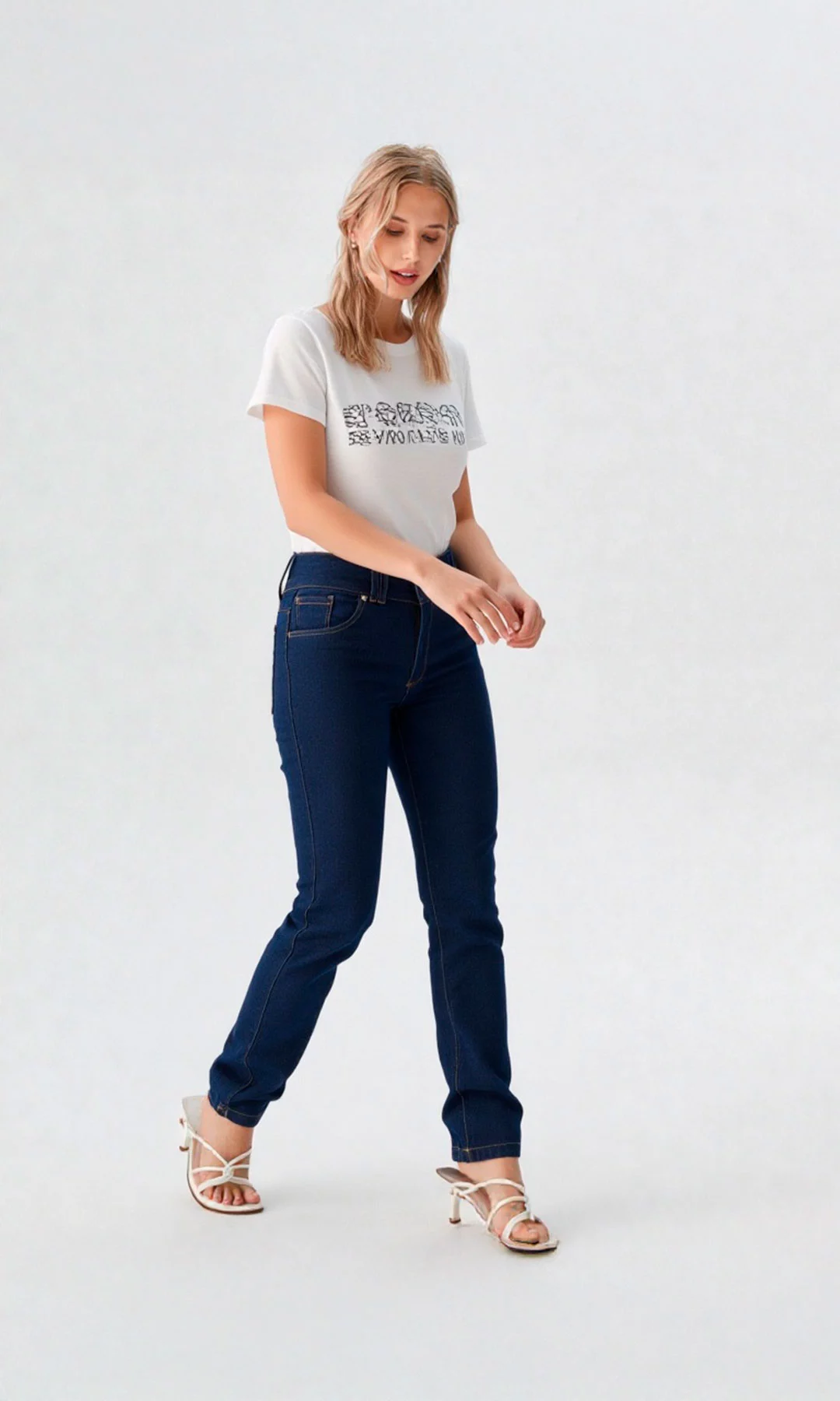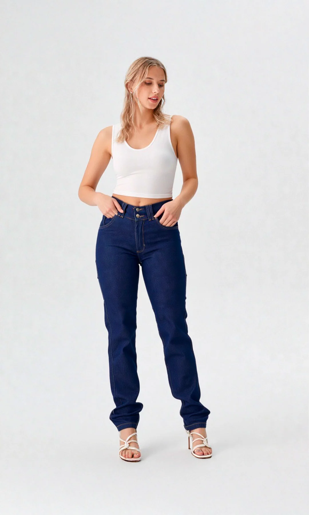 Jean para mujer, tiro alto, bota recta, bolsillos en delantero y de parche en posterior. Es una prenda que horma perfectamente la silueta y levanta la cola.