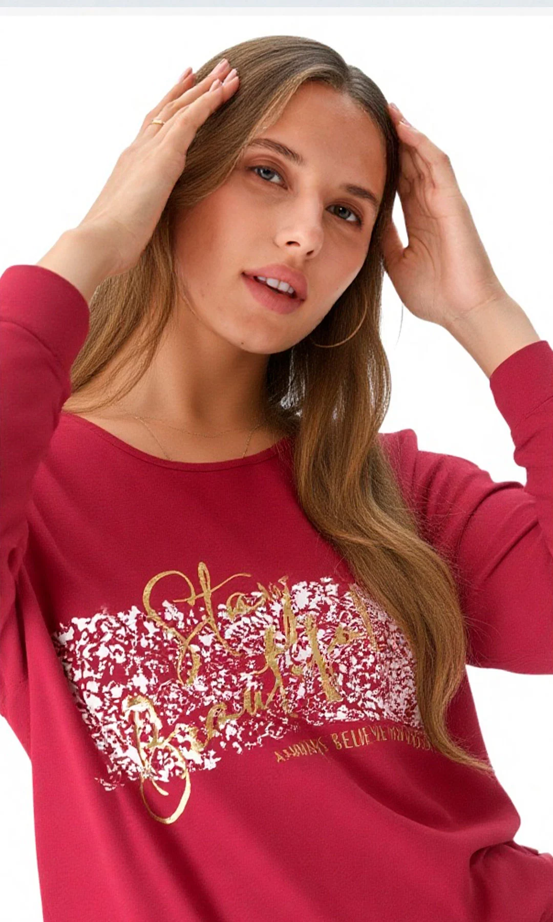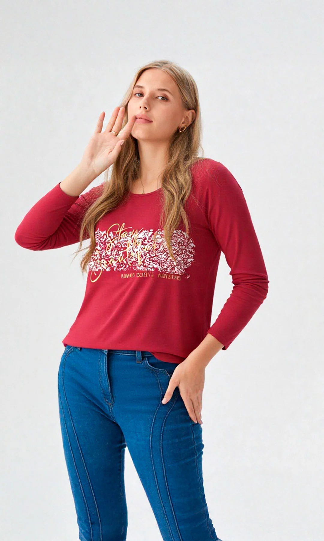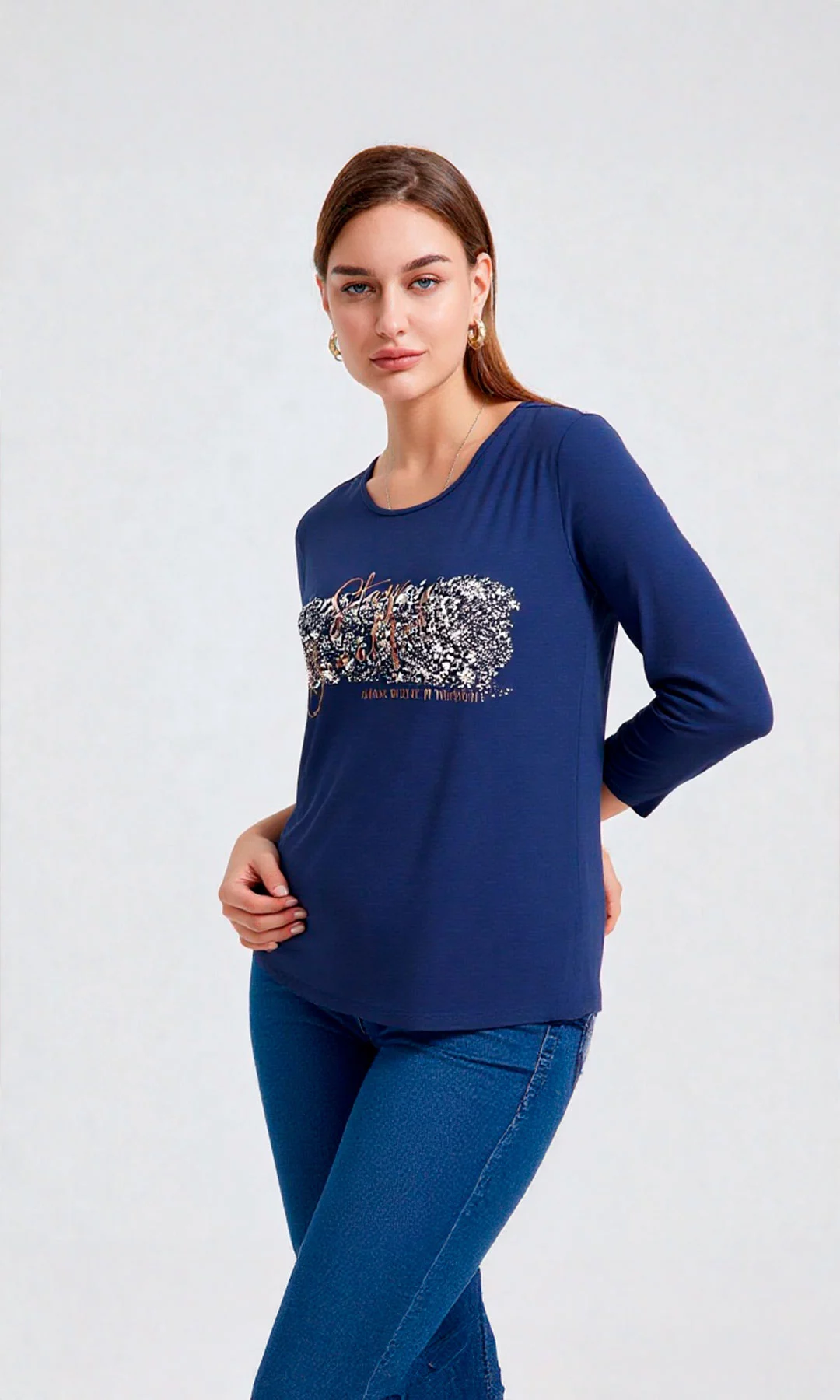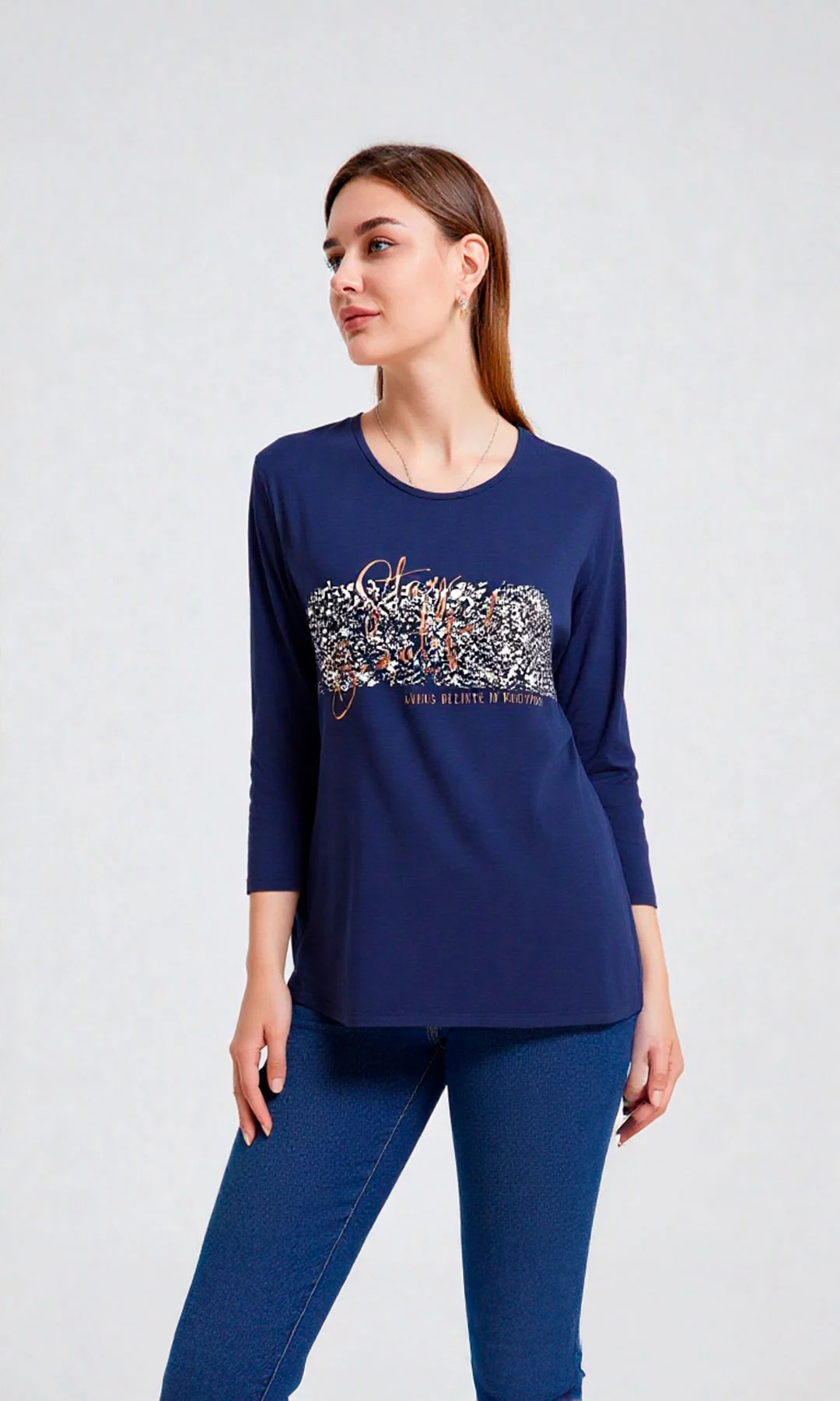 Camiseta para mujer, manga 3/4 recta, con estampado en frente y cuello redondo.